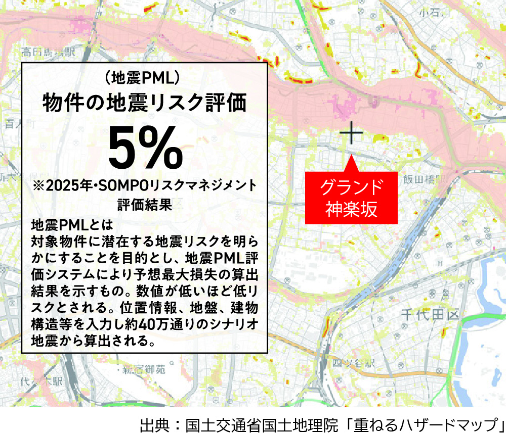 神楽坂の名の通り、坂の上の高台にあり、地盤は武蔵野台地の一部で固い地盤にあります。建物の地震リスク評価(地震PML※)においても5%と高評価な物件です。