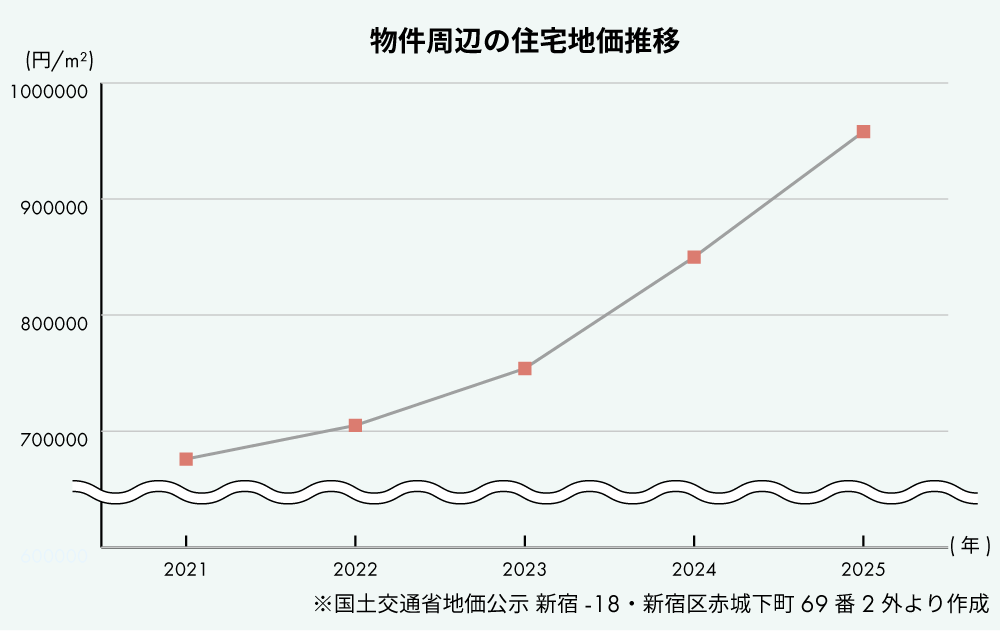神楽坂物件周辺の地価は緩やかに上昇傾向にあり、今後も人気エリアとして価値の向上が見込まれます。