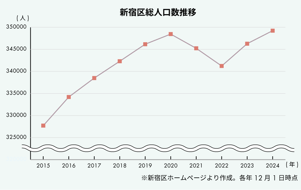 新宿区は東京23区のほぼ中央に位置し、大型施設や企業が多く集まります。商業・観光スポットなどへ多くの国内外の観光客が訪れ、その周辺で働く人口も街の発展によって増加傾向にあります。